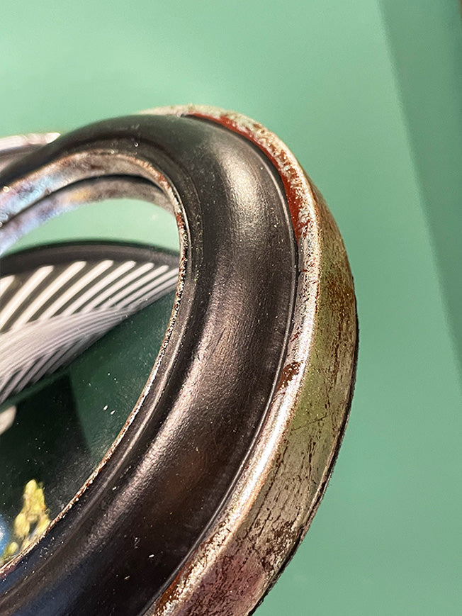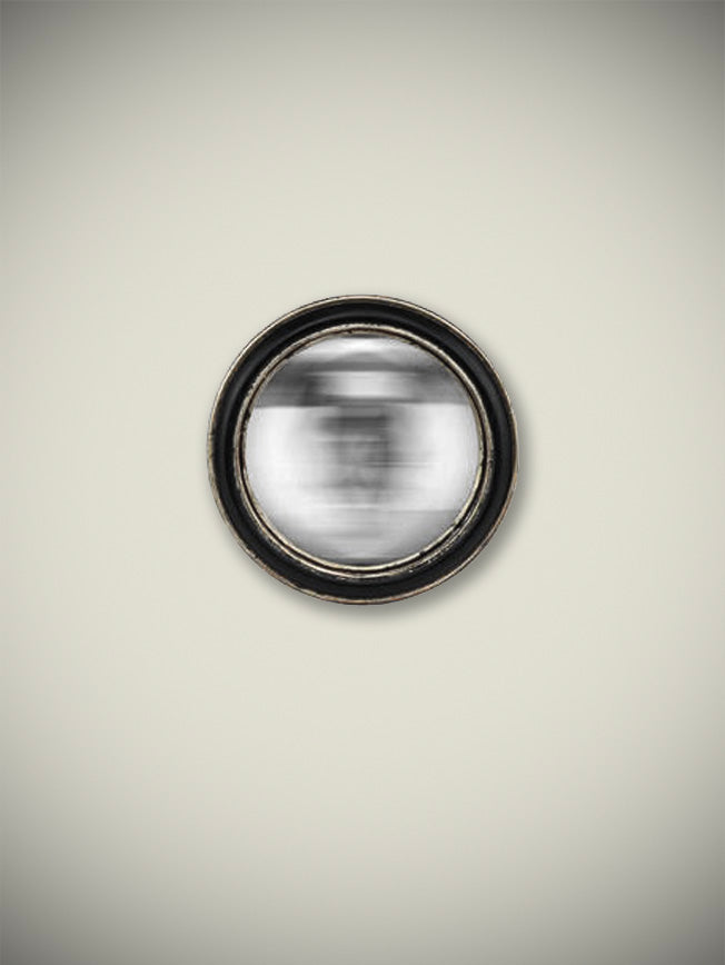 Un espejo convexo redondo con un marco en acabado bicolor en negro y plateado envejecido, de estilo antiguo.