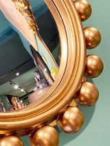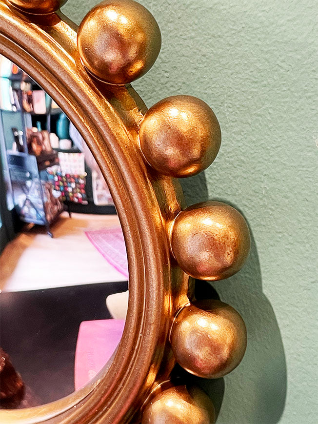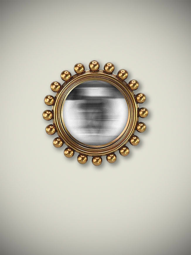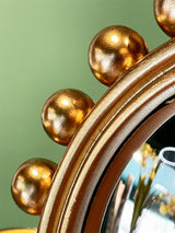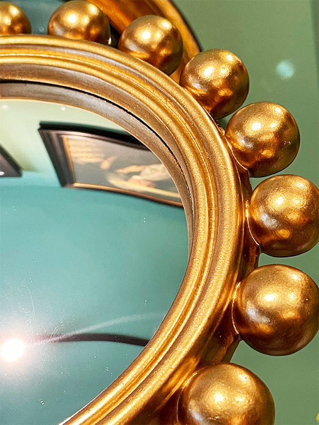 Un espejo convexo redondo con un marco muy original a base de pequeñas bolas decorativas, en acabado dorado envejecido, de estilo vintage.