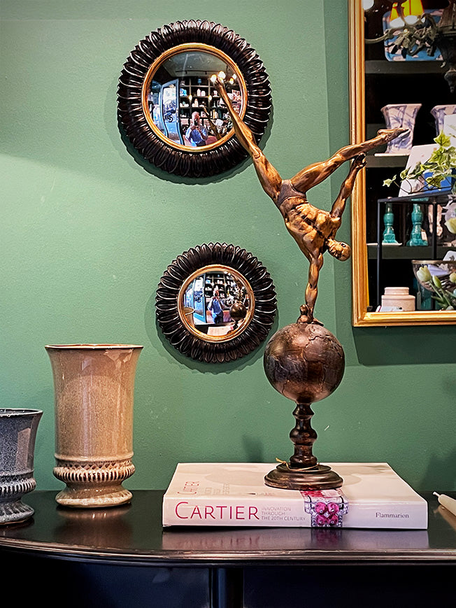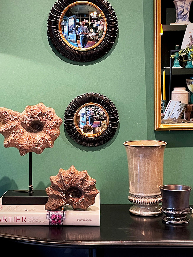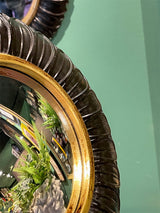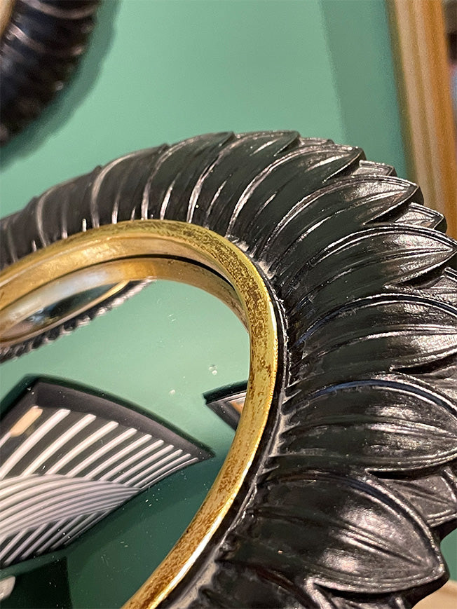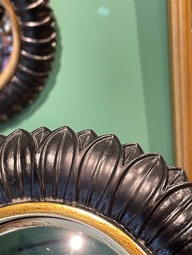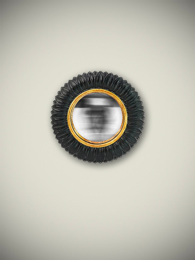 Un espejo convexo redondo de estilo antiguo con un marco en acabado bicolor en negro y dorado envejecido, en forma de flor.