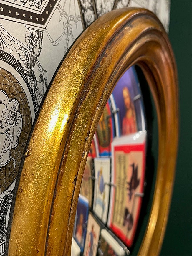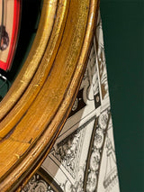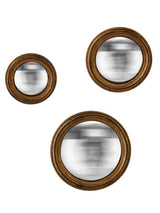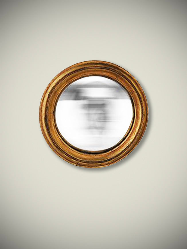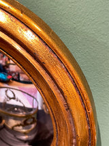 Un espejo convexo redondo con un marco de moldura en acabado dorado envejecido, de estilo clásico.