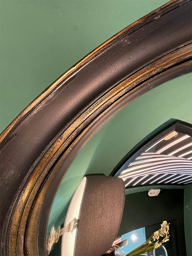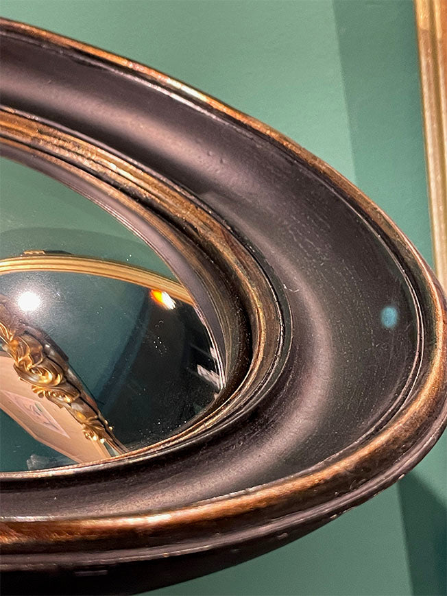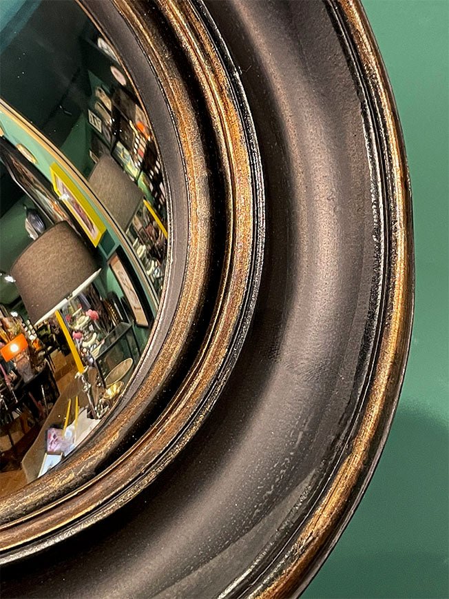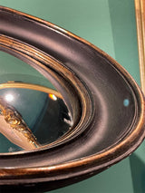 Un espejo convexo redondo con un marco en acabado bicolor en negro y dorado envejecido, de estilo antiguo.