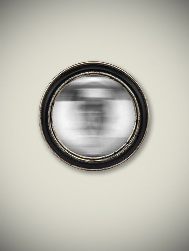 Un espejo convexo redondo con un marco en acabado bicolor en negro y plateado envejecido, de estilo antiguo.
