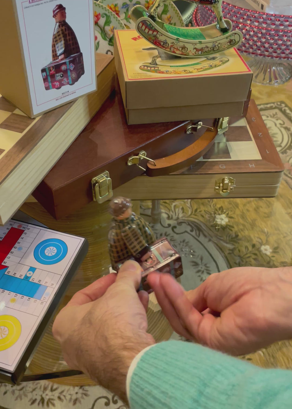 Una figura de lata original en forma de hombre viajero con maleta, inspirada en juguetes antiguos que camina al darle cuerda con una llave especial.