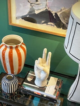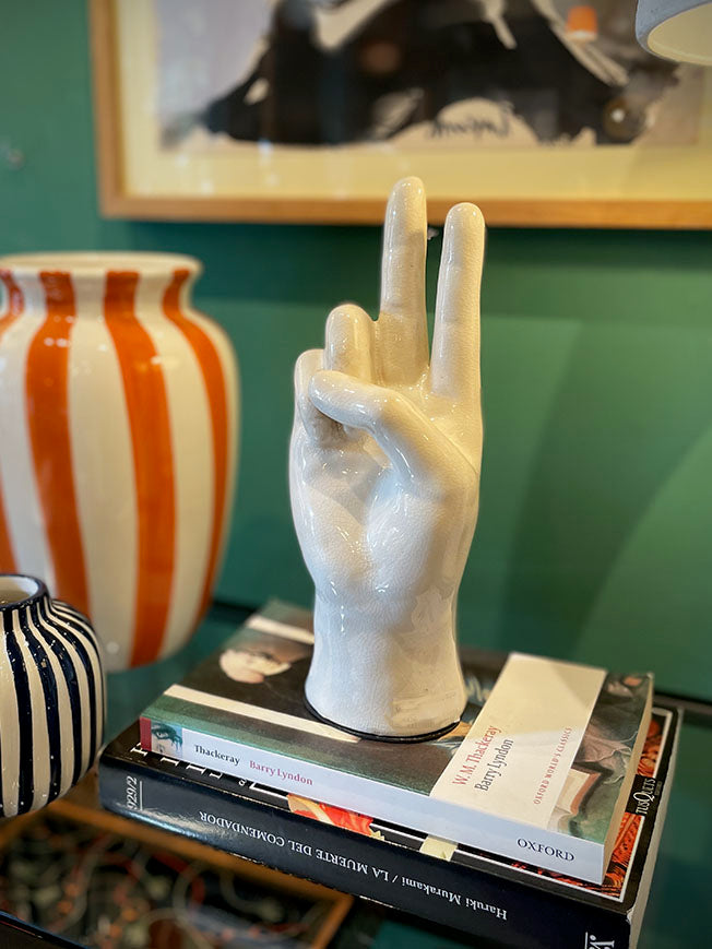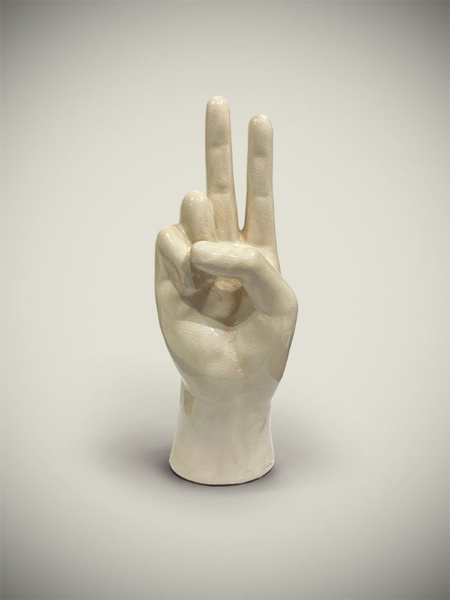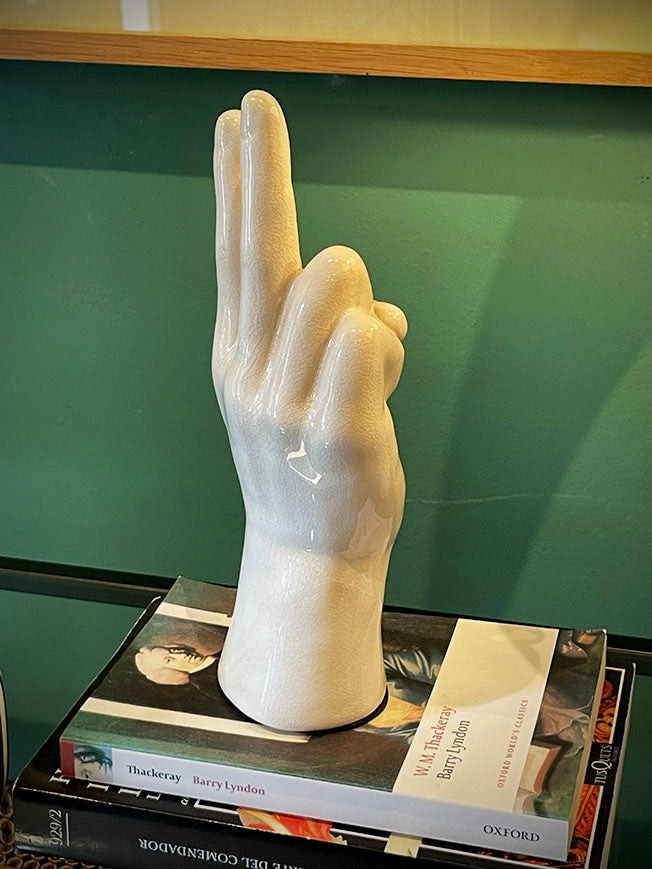 Una figura decorativa muy original en forma de mano haciendo el signo de la victoria, de cerámica.