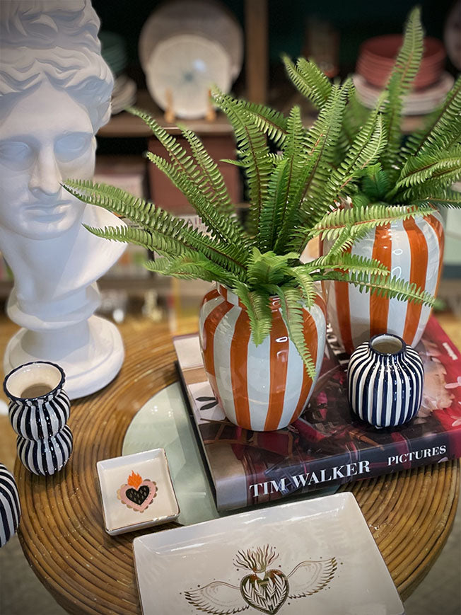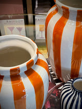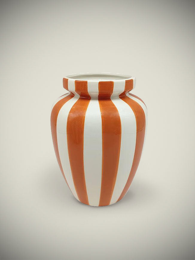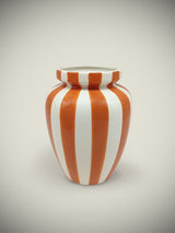 Un bonito jarrón decorativo de cerámica en un fresco diseño con rayas naranjas sobre blanco, ideal para flores y decorar. Ideal para combinarse con la versión grande.
