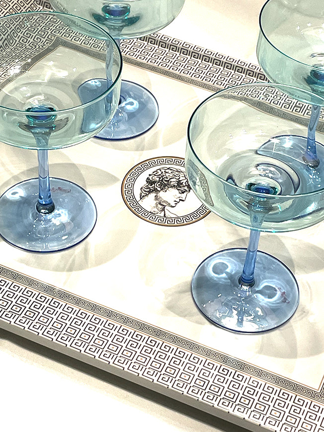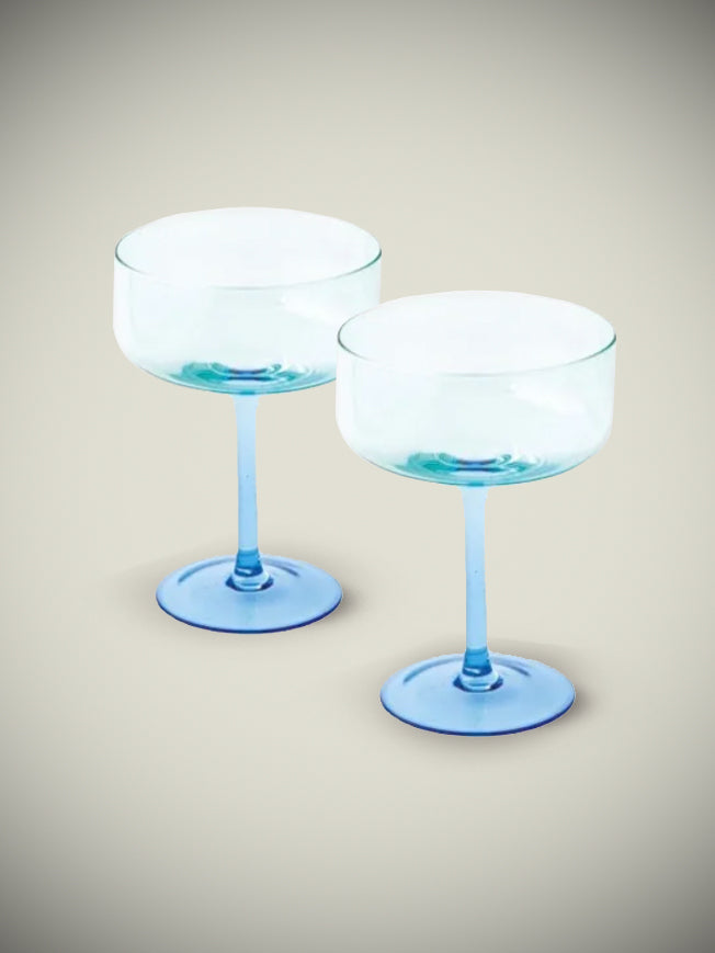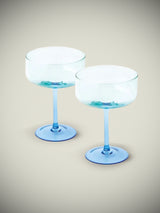 Un juego de 2 copas de champán en cristal soplado a boca en tonalidades azules, hechas a mano artesalmente, con caja de presentación.