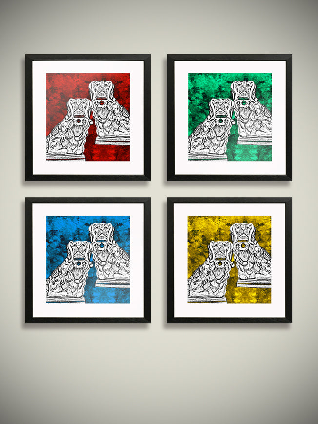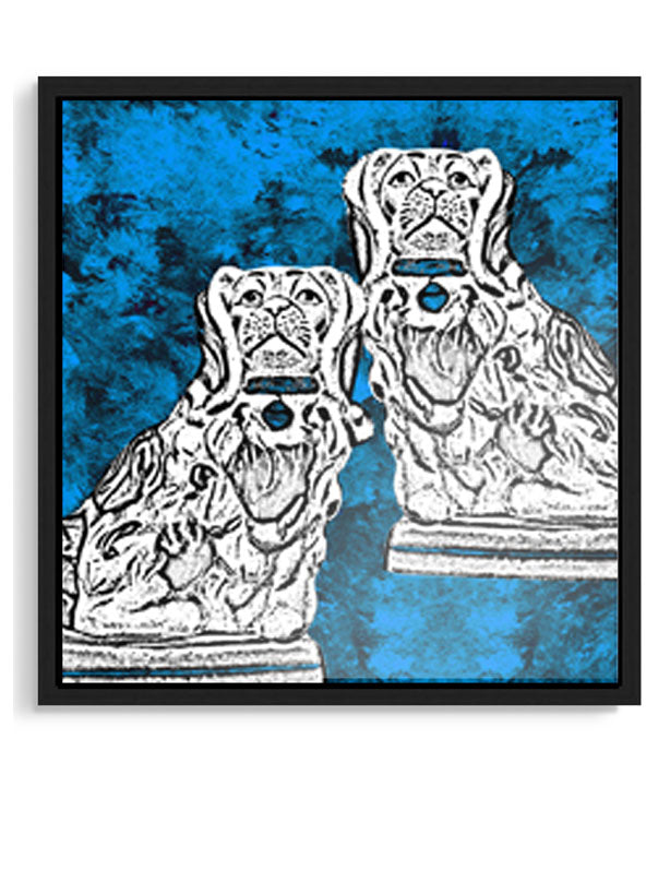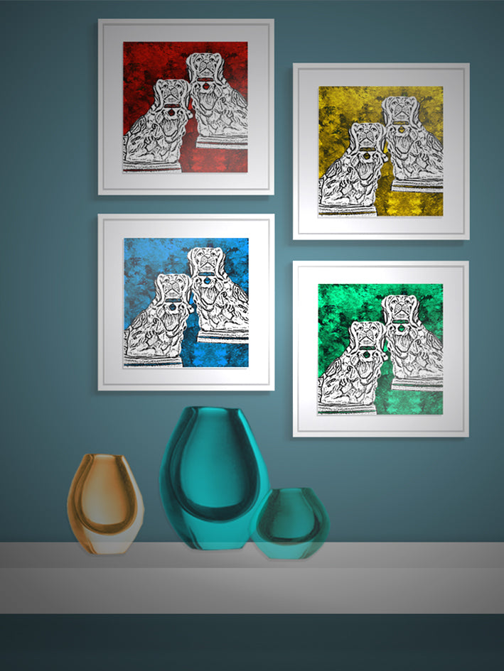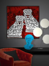 Una lámina de arte con una ilustración de una pareja de perros spaniels King Charles contra un fondo rico en textura y detalle, en cuatro combinaciones de color. Elige el color que más te guste de esta colección de láminas de arte y cuadros.