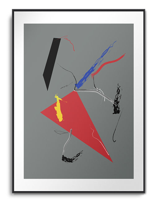 Un llamativo collage abstracto de diferentes formas geométricas en colores básicos, compuesto digitalmente. Disponible en fondo blanco o gris y pareja a juego.