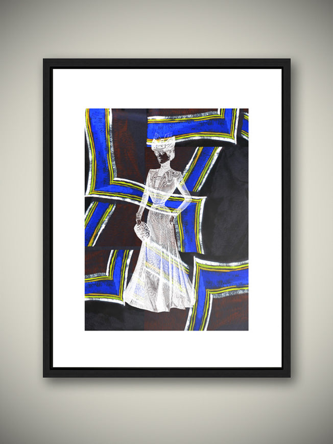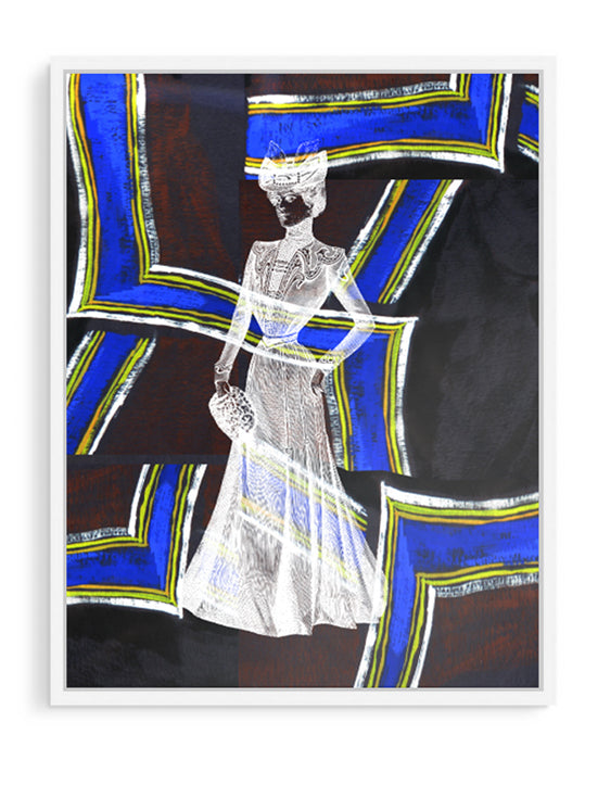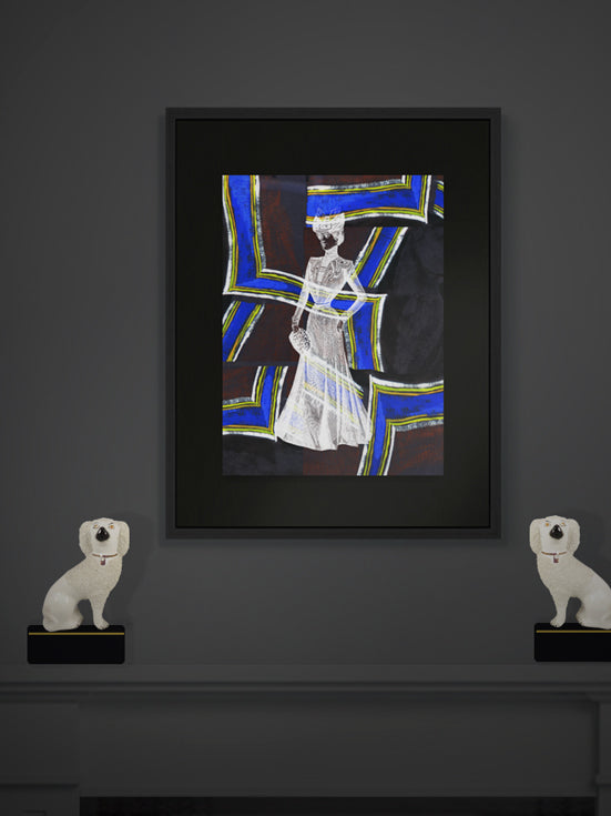 'Virtud Victoriana' es una pieza de estilo vintage que combina una ilustración exquisita de una dama victoriana sobre un fondo geométrico con una rica combinación de colores.