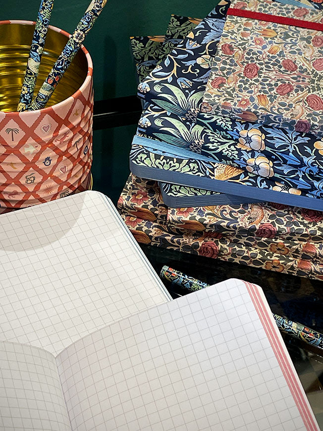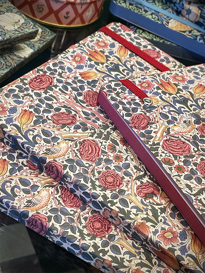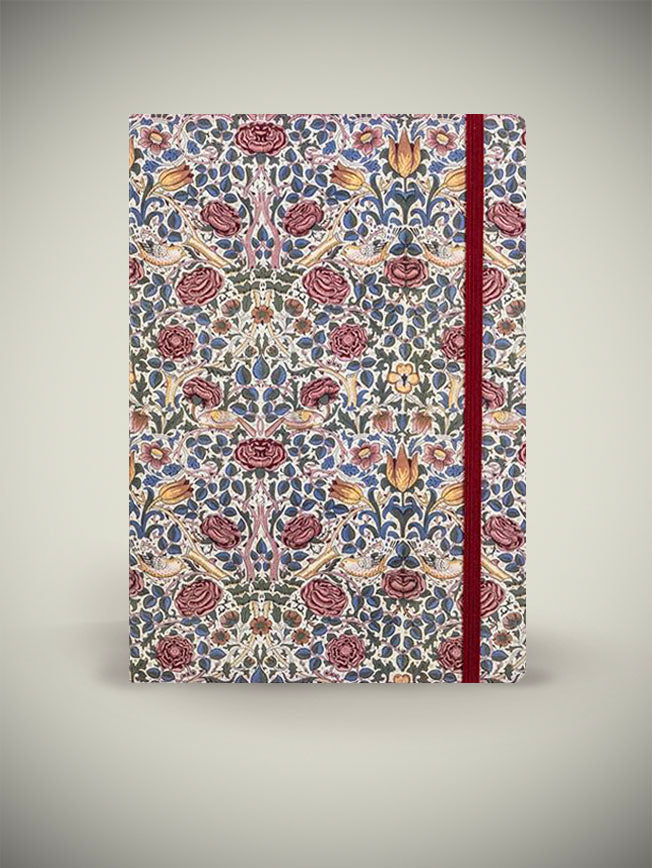Una libreta original de tamaño A5 con el famoso estampado floral 'Rose' de William Morris.