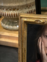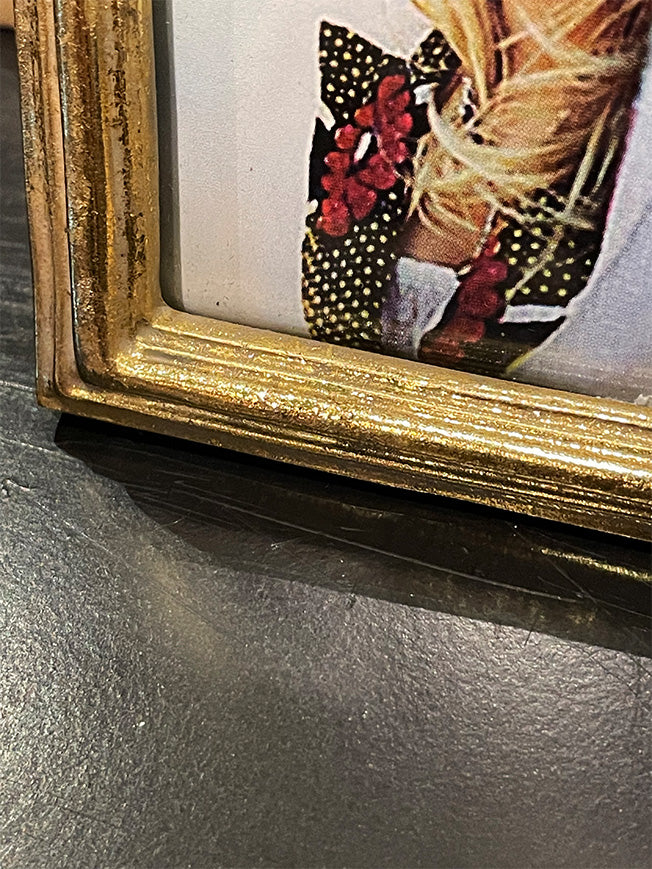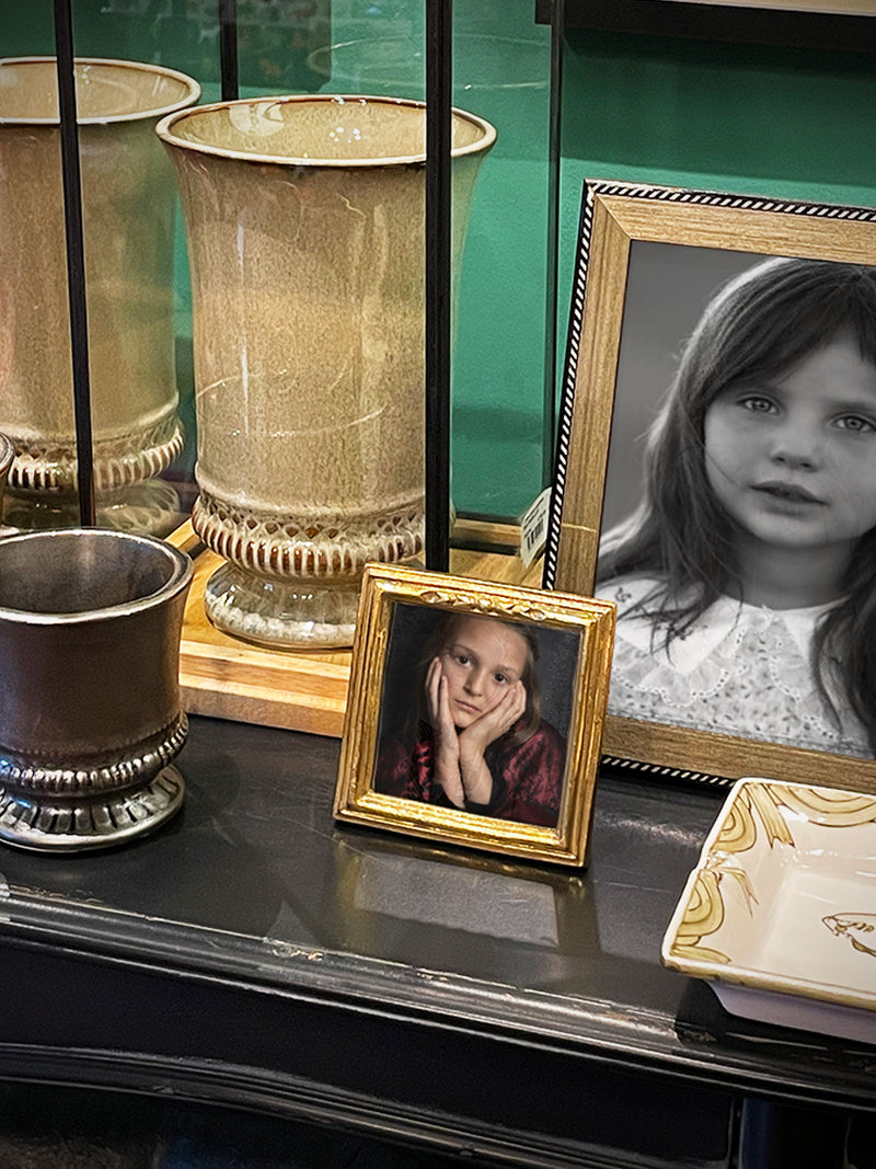 Un marco de fotos de estilo antiguo, de forma cuadrada y con moldura en un acabado dorado.