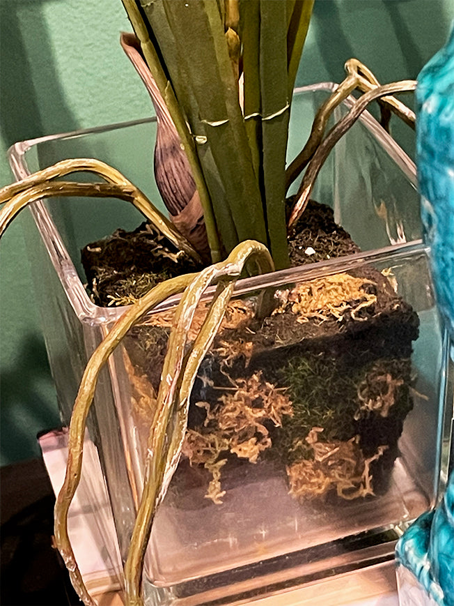 Descubre nuestra selección de flores artificiales para decoración como esta fantástica orquídea amarilla 'Oncidium' con jarrón de cristal transparente, ideal para decoración de interiores, decoraciones florales, en jarrones y centros.