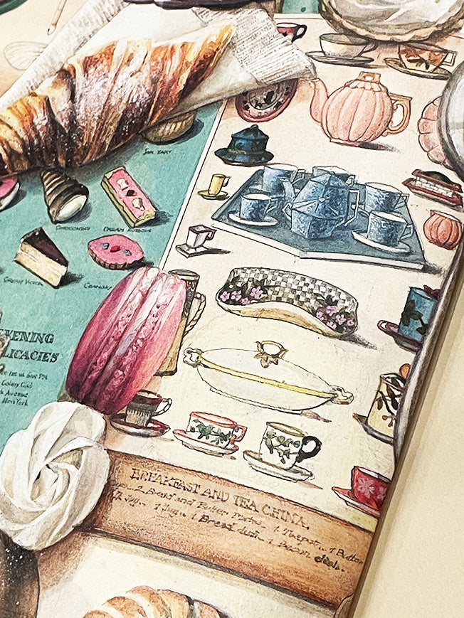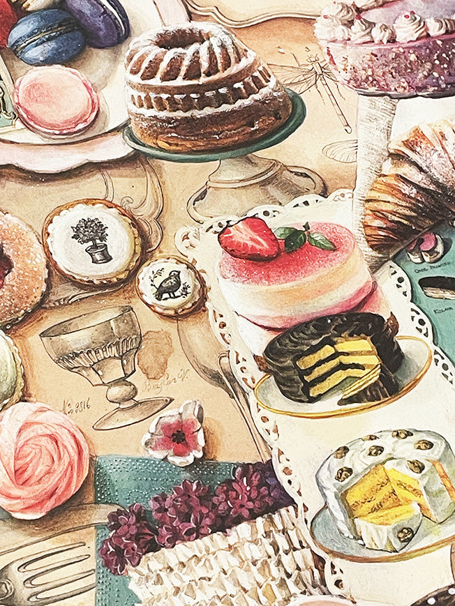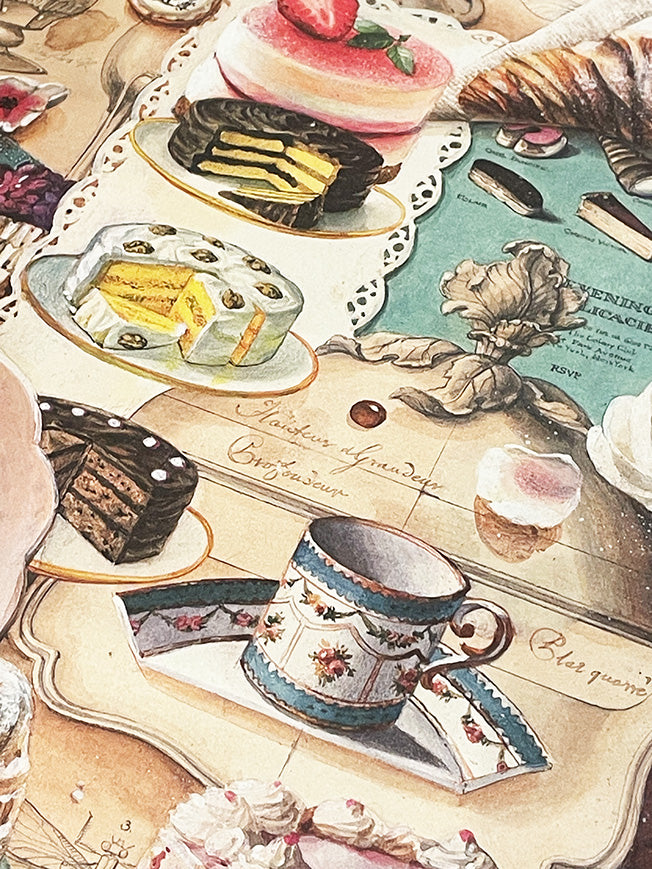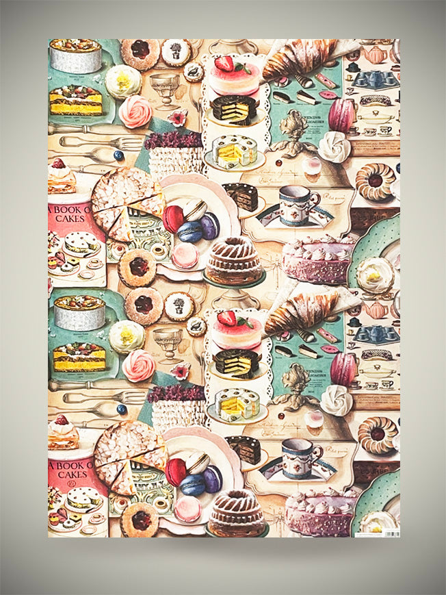 Un papel de envolver de gran formato con una fabulosa ilustración de deliciosos pasteles, dulces y tartas en una composición clásica de estilo vintage, con mucho color, detalle y totalmente irresistible para los adictos a la buena pastelería.