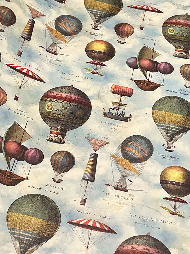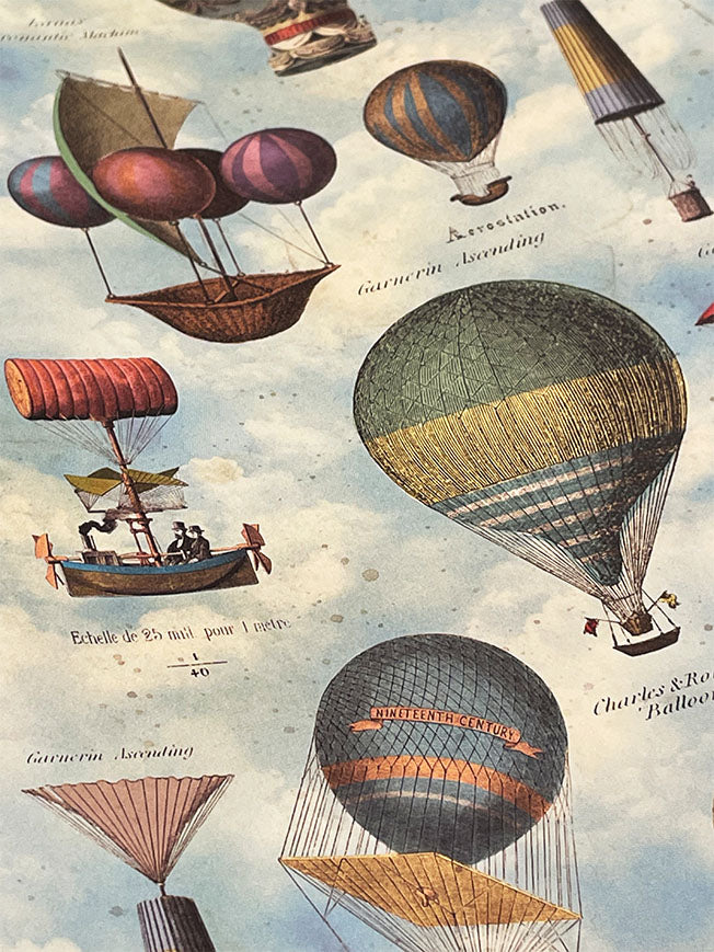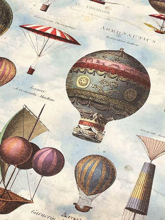 Un papel de envolver de gran formato muy original con ilustraciones fabulosas de elegantes globos aéreos de estilo vintage sobre un cielo de nubes de fondo.