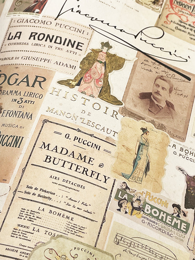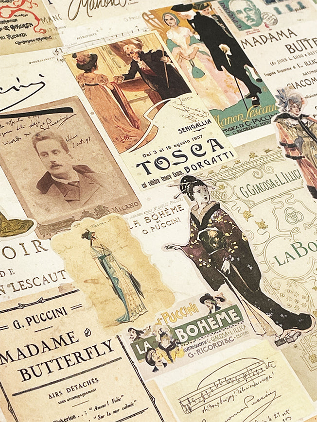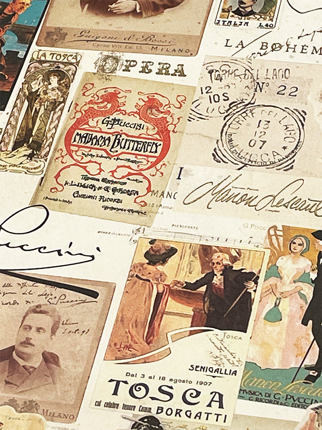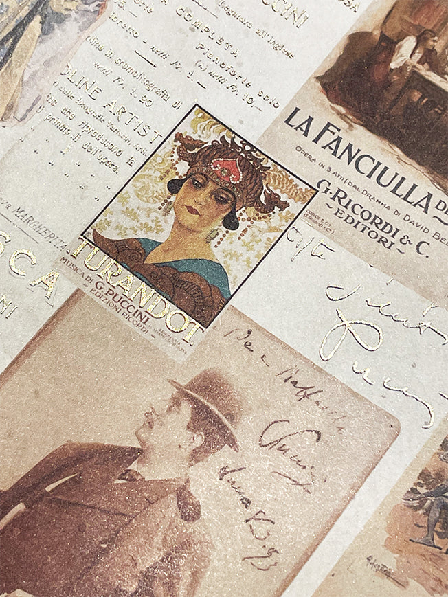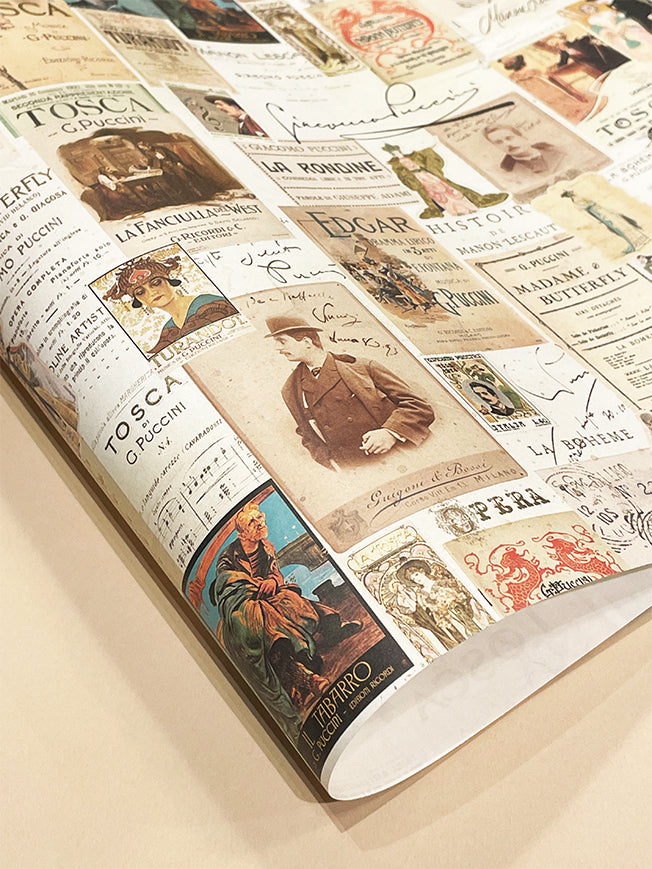 Un papel de envolver de gran formato con un collage de carteles e ilustraciones de las famosas operas de Puccini como Madama Butterfly, Tosca, Turandot o Manon Lescaut, con detalles en estampación dorada.