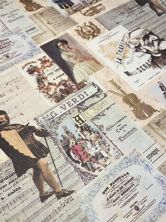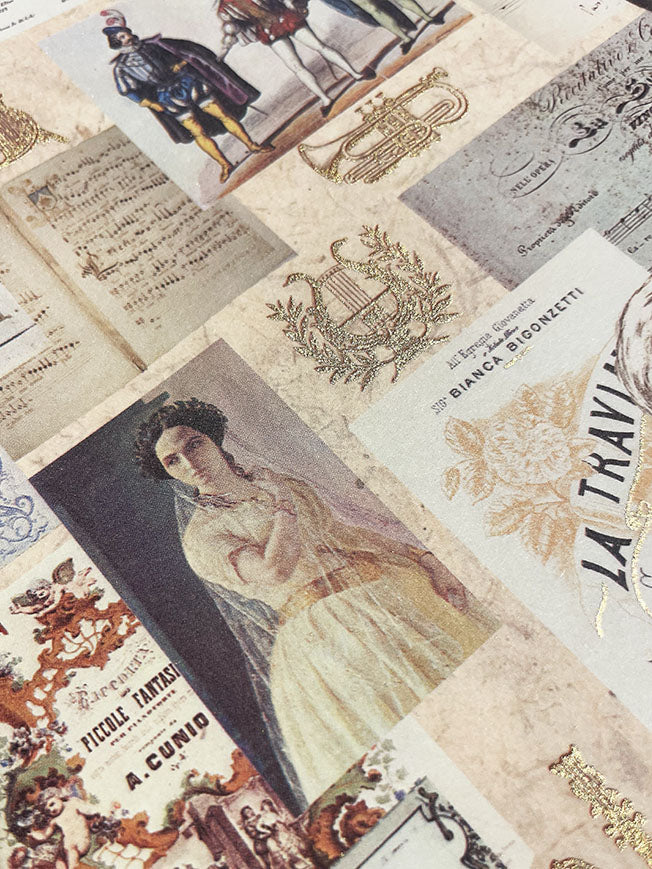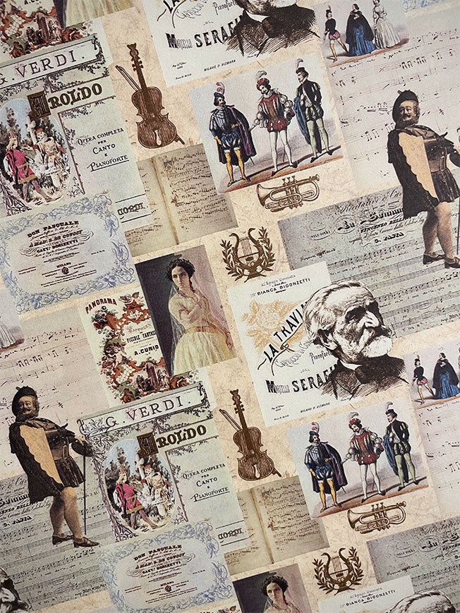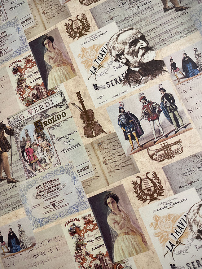 Un papel de envolver de gran formato con un collage de carteles e ilustraciones de las famosas operas La Traviata de Verdi, Aroldo, La Sonambula o Don Pasquale con detalles en estampación dorada.