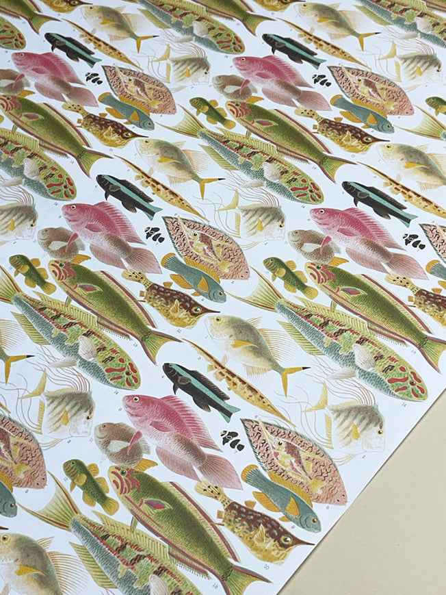 Una hoja de papel de envolver reversible en estampado marino con un diseño de corales y algas por una cara y peces por la otra, editado por Museums & Galleries a partir de ilustraciones originales de los archivos del Natural History Museum de Londres.