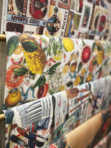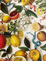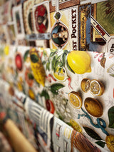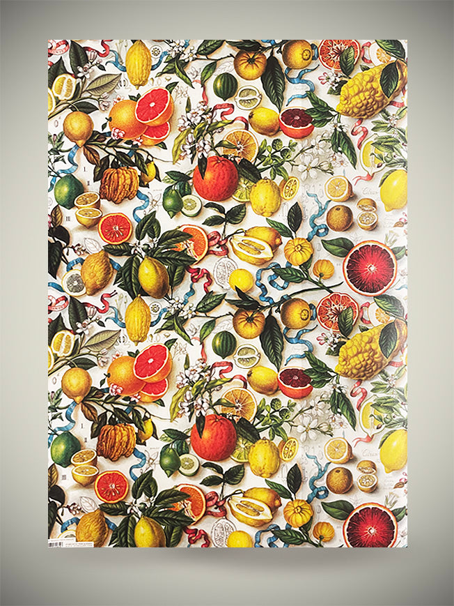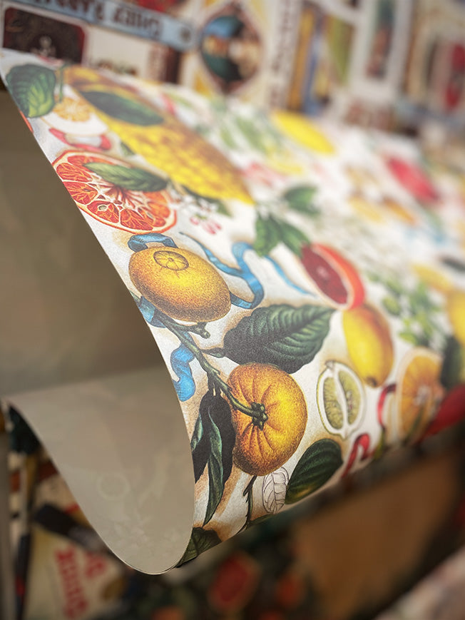 Un papel de envolver de gran formato con una fabuloso estampado alegre y veraniego inspirado en la costa de Amalfi con limones y naranjas en una composición de estilo vintage con mucho color y detalle.