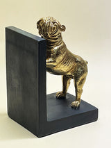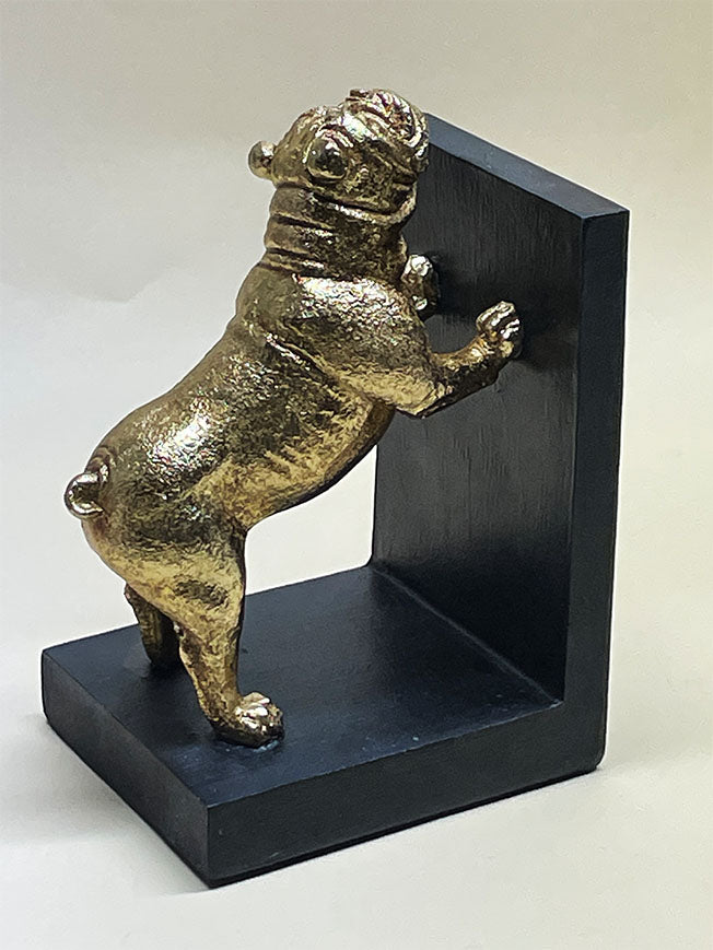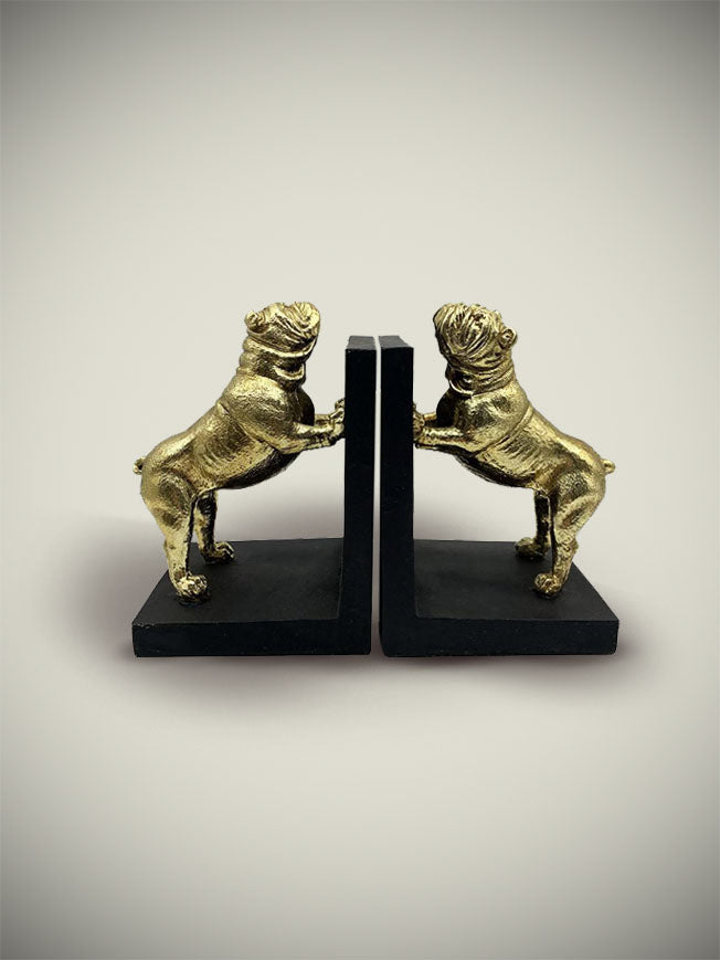 Un elegante par de sujeta libros con una pareja de perros carlinos en acabado dorado sobre bases en forma de L en negro.