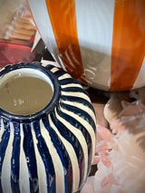 Un pequeño jarrón decorativo de cerámica en un fresco diseño con rayas azules sobre blanco, ideal para flores y decorar.