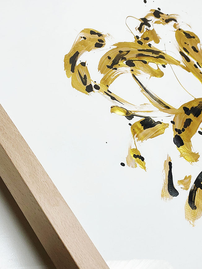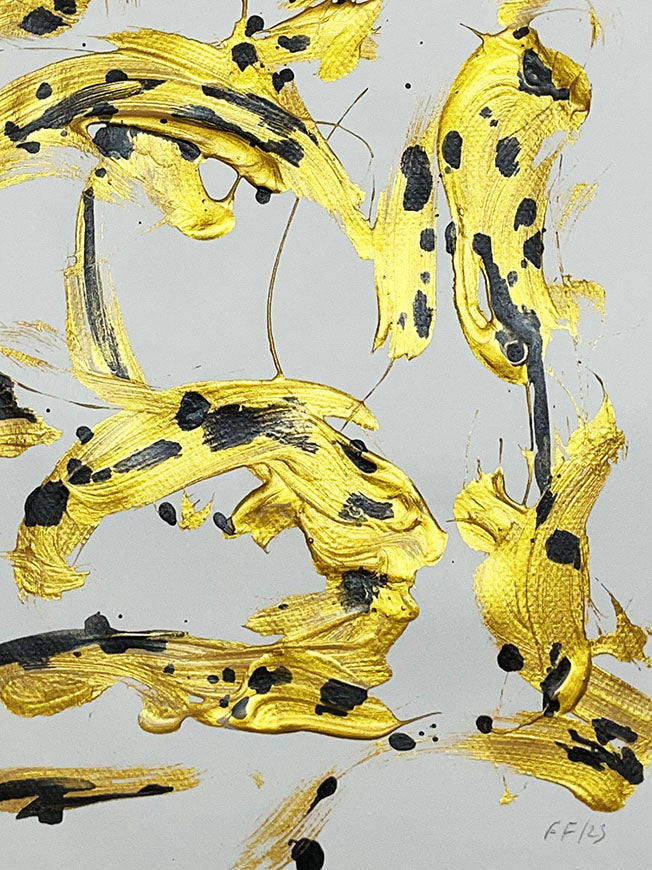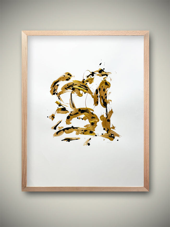 Pintura original abstracta sobre papel en la que el dorado y el negro irrumpen con fuerza e intensidad sobre el blanco de fondo.