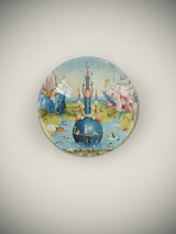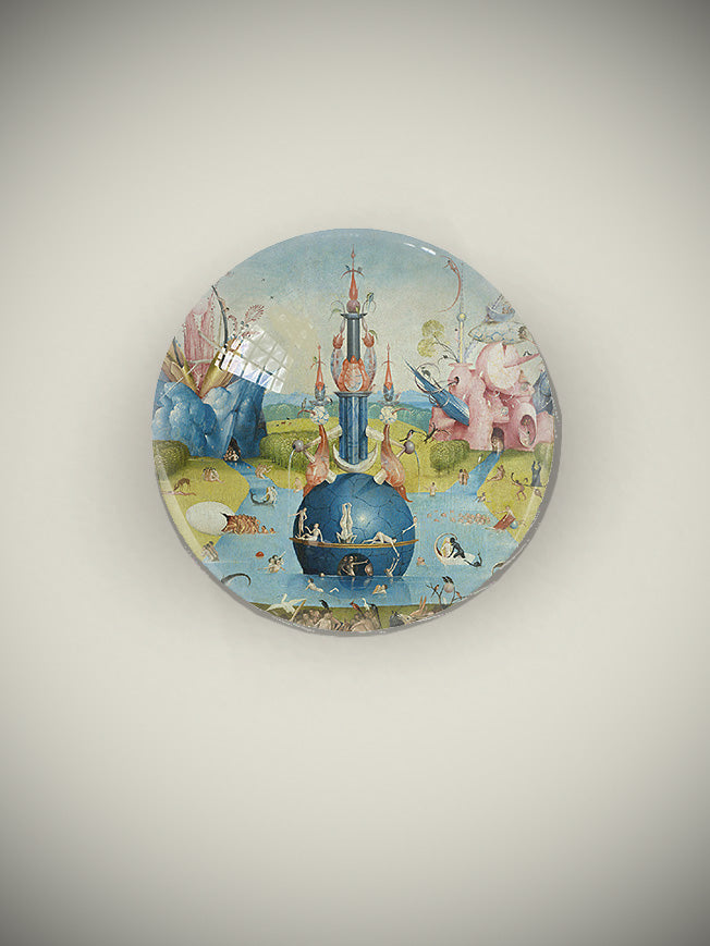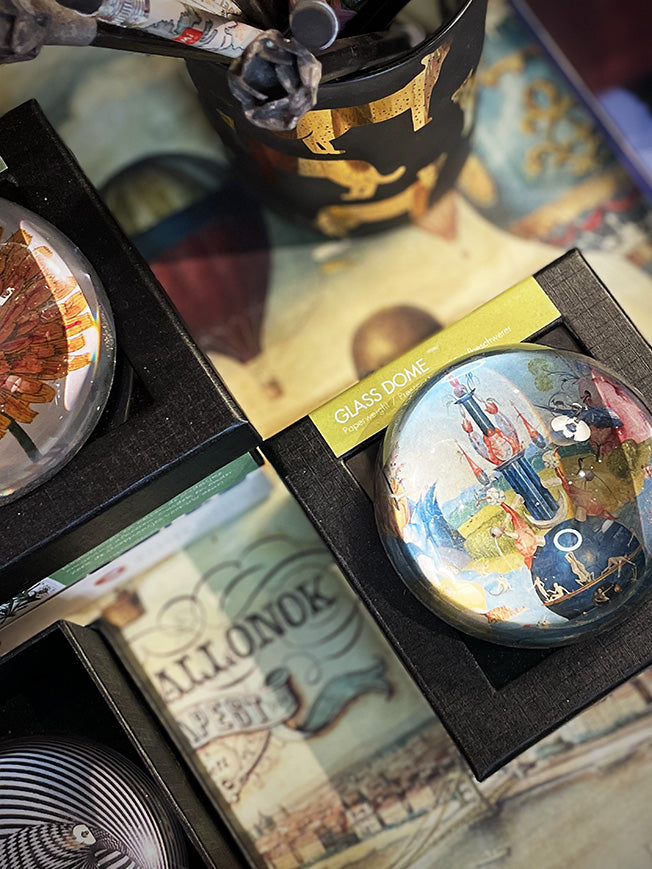 Un elegante pisapapeles de cristal con la reproducción de un fragmento de la conocida obra de El Bosco, El Jardín de Las Delicias'
