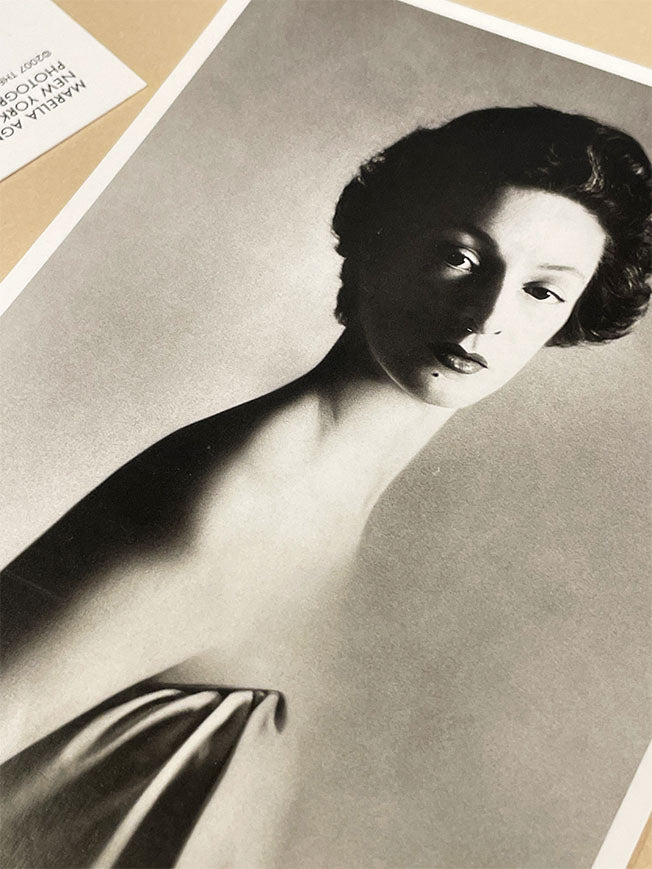 Una postal de felicitación original con la reproducción de la fotografía original de la famosa aristócrata italiana Marella Agnelli de Richard Avedon, en New York en 1953.