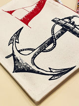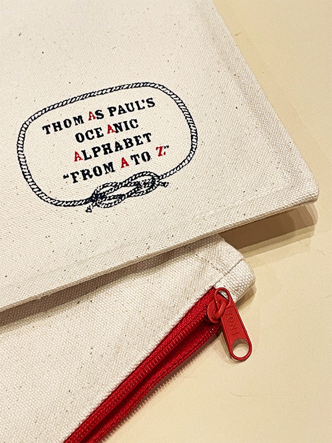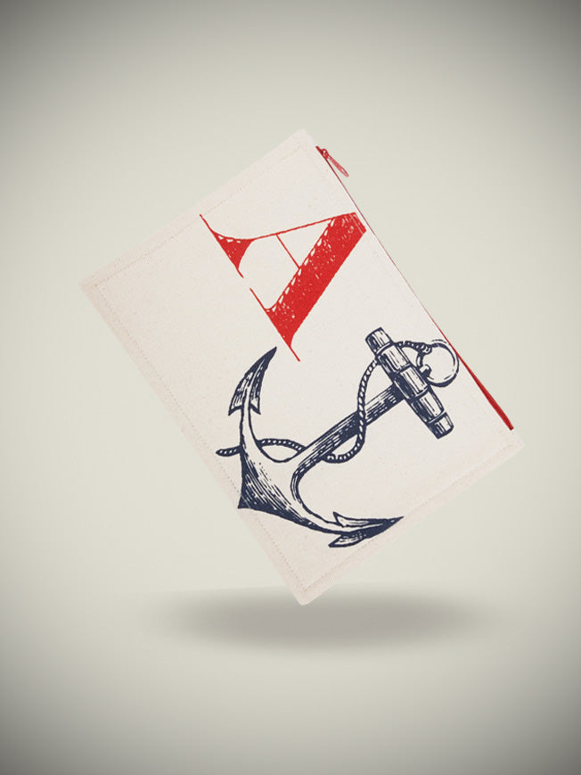 Un pouch en lino natural con la letra 'A' de Ancla en tipografía de estilo vintage y una original ilustración de éste en blanco y negro. En el reverso, otra fabulosa ilustración del logo de esta colección de Thomas Paul, de título Oceanic Alphabet 'From A to Z'.