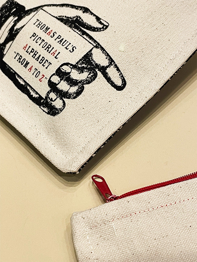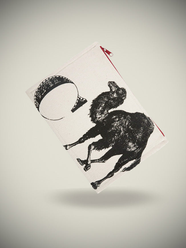 Un pouch en lino natural con la letra 'C' de Camello en tipografía de estilo vintage y una original ilustración de éste en blanco y negro. En el reverso, otra fabulosa ilustración del logo de esta colección de Thomas Paul, de título Pictorial Alphabet 'From A to Z'.