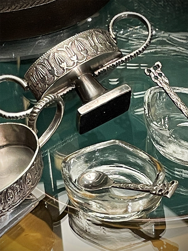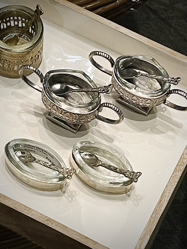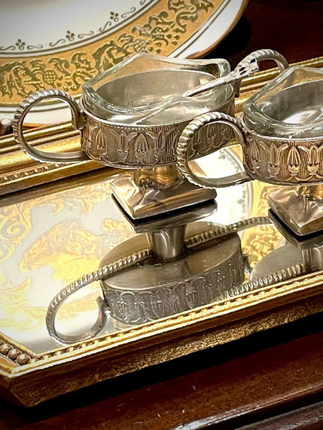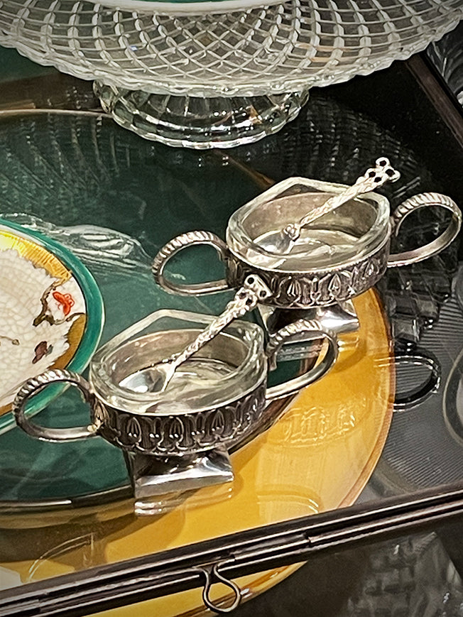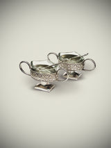 Una exquisita pareja de salero y pimentero reproducida a partir de piezas originales antiguas. En una delicada forma de urna con exuberantes asas en metal niquelado envejecido. Con cuencos de cristal y cucharitas.