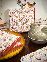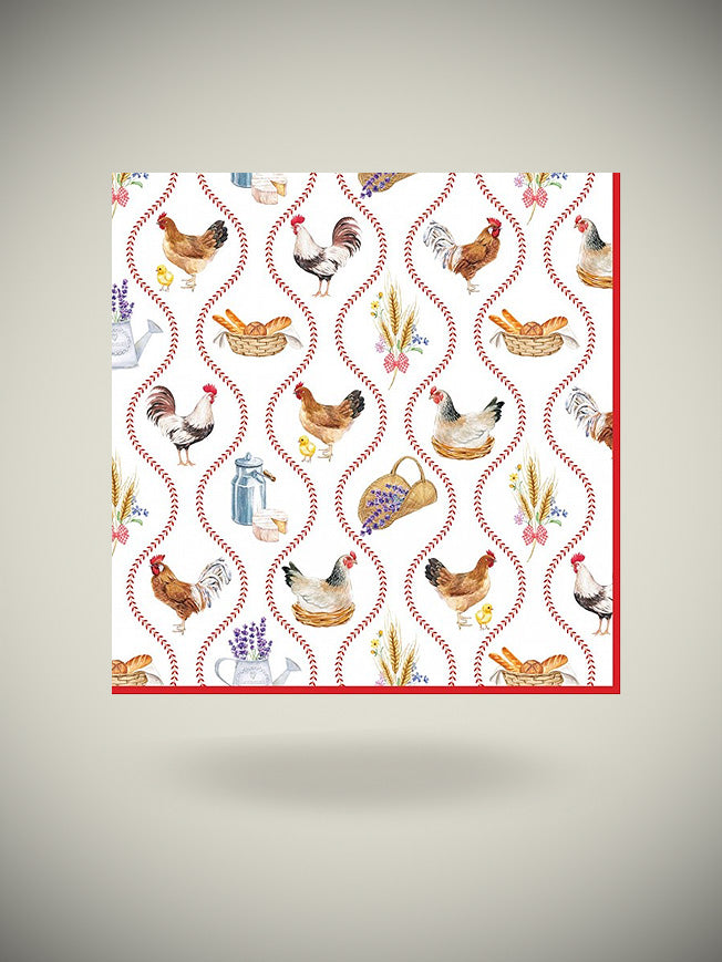 Un pack de 20 servilletas de papel, en un diseño tradicional y campestre con un estampado ideal con ilustraciones de gallos, gallinas, trigo, panecillos y más.