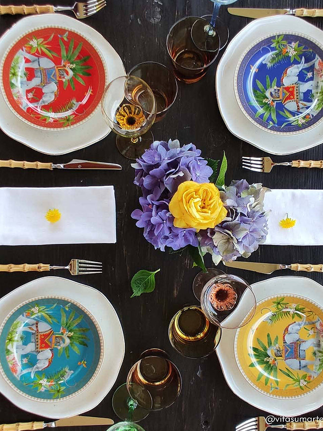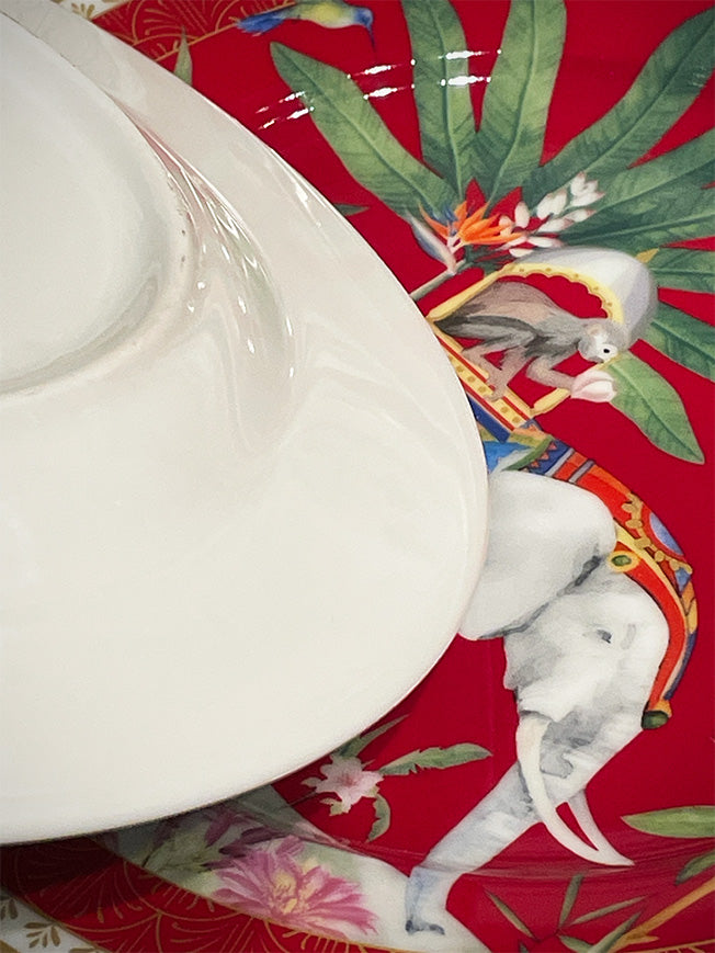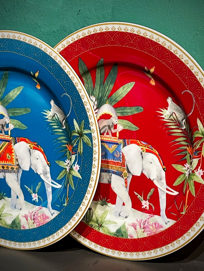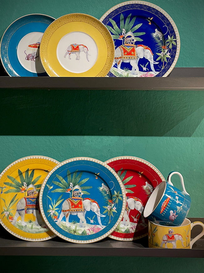 Un set de 4 platos de postre de porcelana, en un diseño clásico y colorido con la elegante ilustración de un elefante y otros animales sobre 4 fondos de color, inspirados en la India y su tradición.