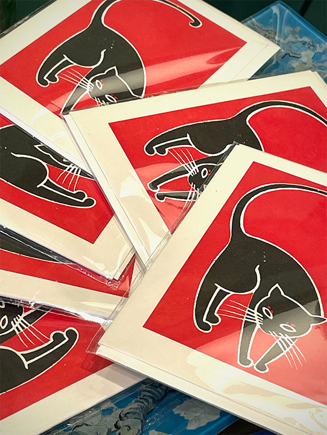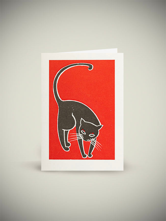 Una original tarjeta de felicitación con una exquisita ilustración de un gato negro sobre un fondo de color rojo.