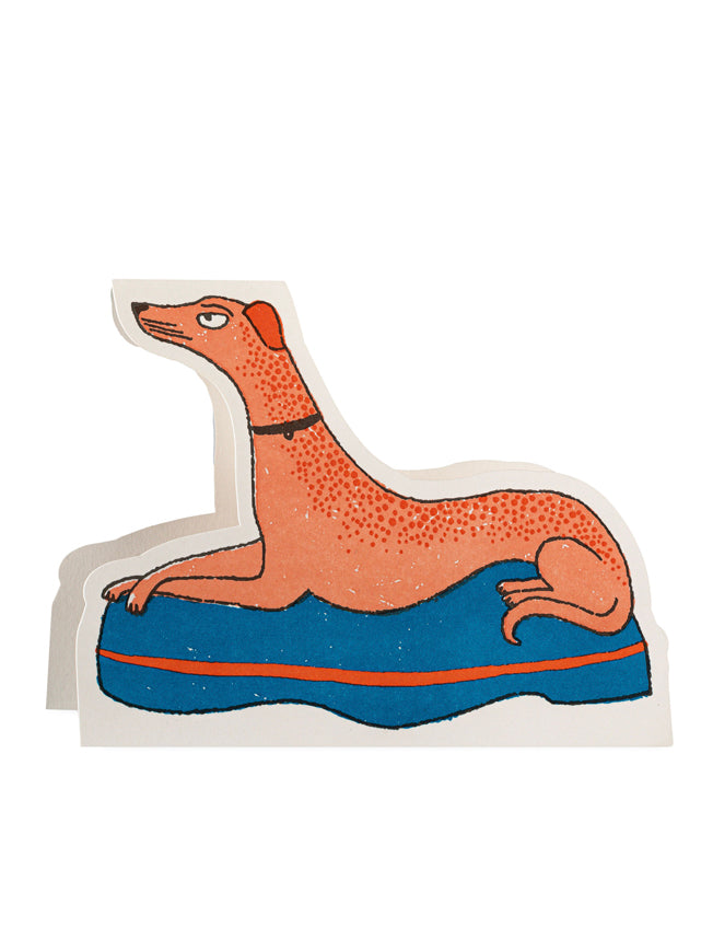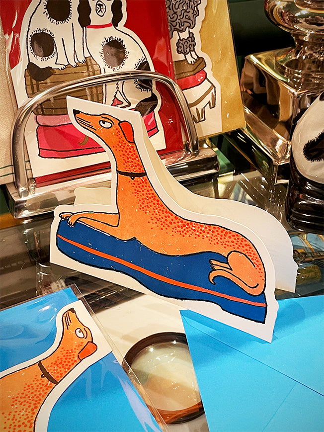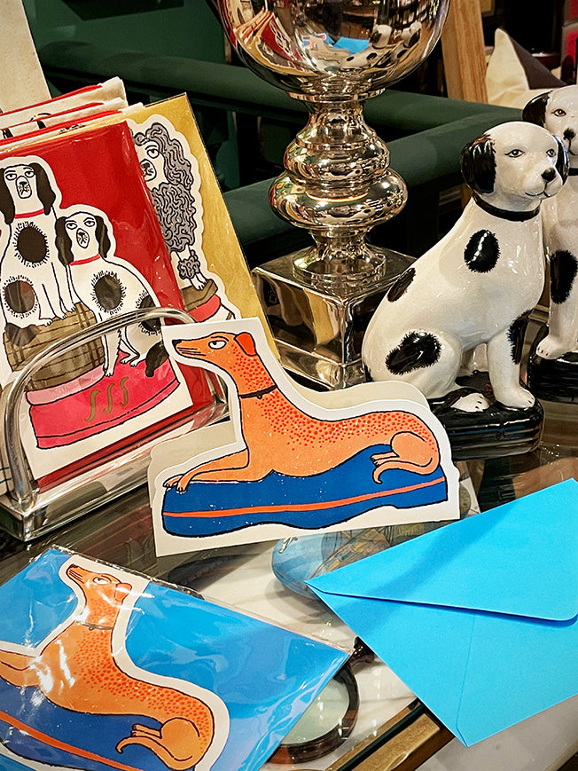 Una fabulosa tarjeta de felicitación con la ilustración de un perro galgo con las patas cruzadas, de la artista Charlotte Farmer, basada en figuras originales de estilo Staffordshire.