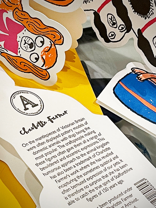 Esta ilustradora inglesa es famosa por su pasión por las figuras de animales de cerámica que decoraban las chimeneas de la Inglaterra victoriana, y en concreto los perros, a los que se les daba expresiones y aires excéntricos con un toque de humor. Después de 150 años, con la tarjeta de felicitación 'Crossed Paw Dog', Charlotte Farmer ha sabido captar la esencia de esas figuras llamadas Staffordhire, en una colección para la imprenta Archivist, en Oxfordshire.