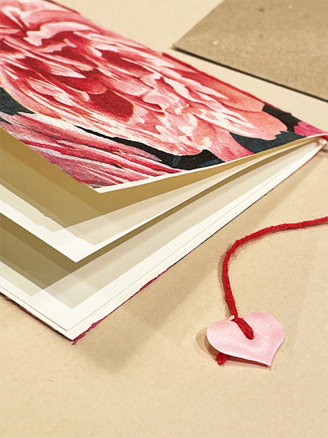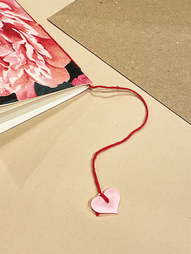 Medidas: 115 x 165 mm | Doblada por la mitad con sobre | Con dos páginas en su interior, encuadernadas con hilo rojo y colgante corazón | Sin mensaje en el interior