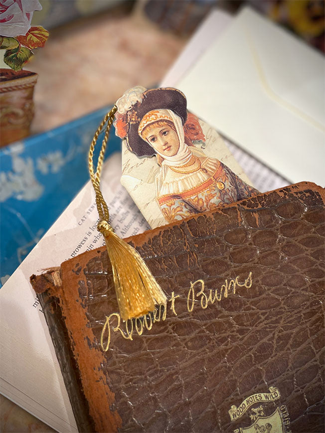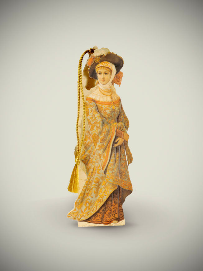 Una exquisita tarjeta de felicitación y punto de libro con una dama victoriana de carácter nostálgico y vintage. Un diseño original troquelado y con relieve, con una borla colgante, diseñado e impreso en Inglaterra.