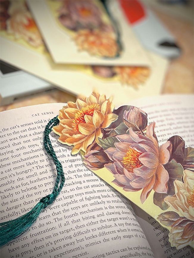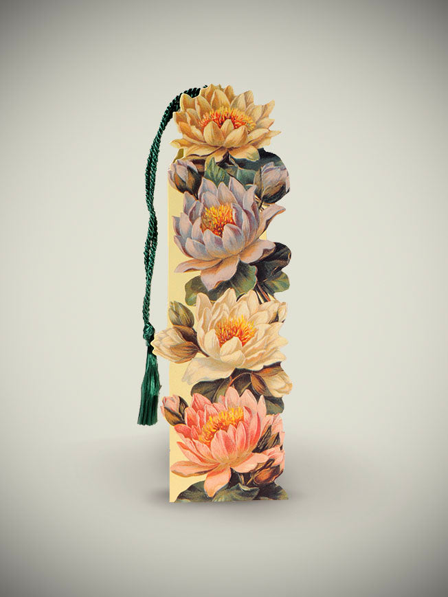 Una elegante tarjeta de felicitación y punto de libro con una bonita composición floral de coloridos lirios de agua, de carácter nostálgico y vintage. Un diseño original troquelado y con relieve, con una borla colgante, diseñado e impreso en Inglaterra.