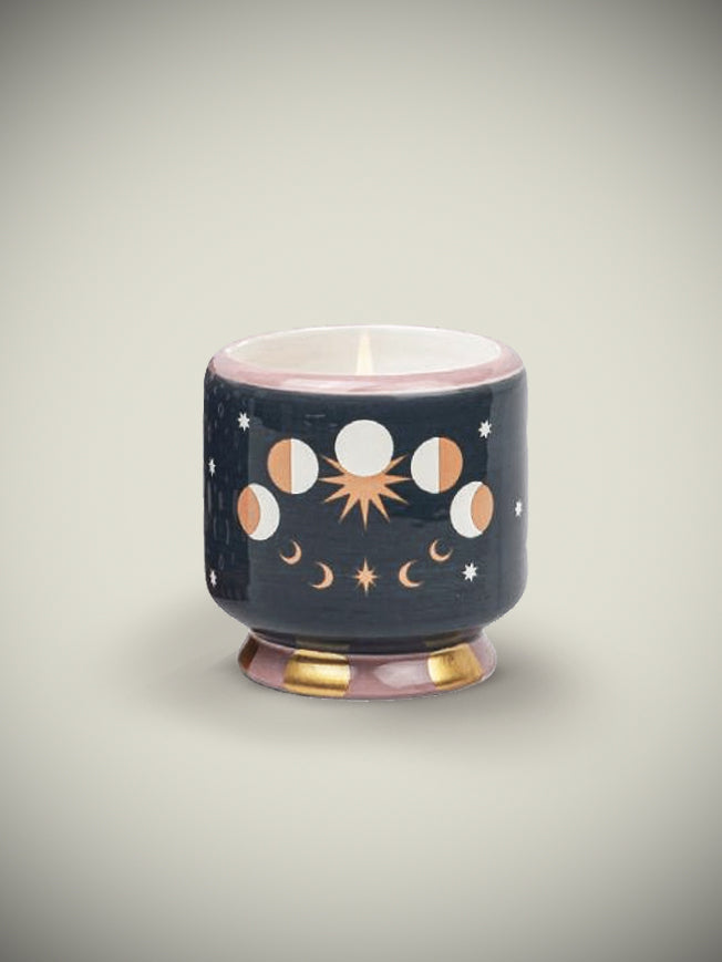 Una vela aromática original y atrevida inspirada en el Mediterráneo y más allá, con un frasco de cerámica con detalles pintados a mano. Con un maravilloso diseño ilustrado con fases lunares sobre un fondo azulado y con un delicioso aroma de jazmín y rosa.